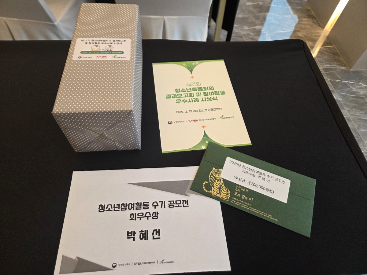 3학년 박혜선(학번: 20230260) 학생이 ‘2025 청소년 참여활동 수기 공모전’에서 영예의 최우수상(성평등가족부 장관상)을 수상하였습니다.