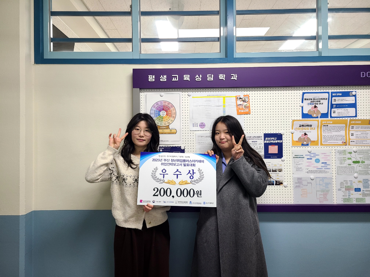 우리 학과 4학년 김도경 학생과 박지현 학생(평생교육·청소년상담학과)은 [2025 부산 청년취업플러스아카데미 취업전략보고서] 발표대회에 참여하여 우수상을 수상하는 성과를 거두었습니다.