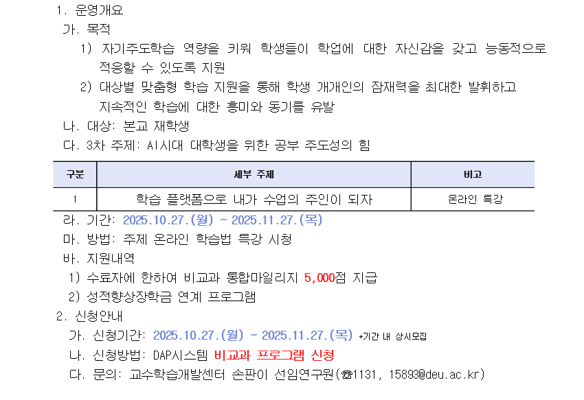 [대학혁신지원사업] 2025학년도 DEU 학습법 특강(3차) 신청 안내